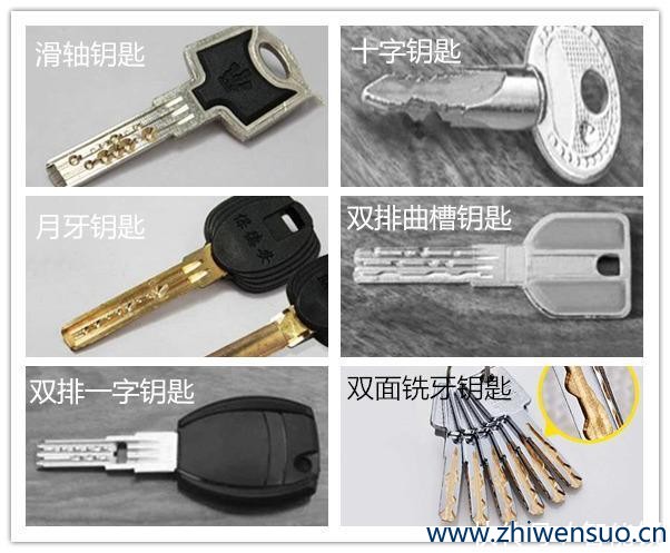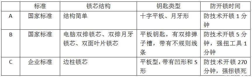 目前智能指纹锁的标配都是C级锁芯,国家机械锁具标准只分了A和B两个级别,我们所说的C级是企业标准,又被成为超B级锁芯。我们平时家里用的锁,基本都是A级或B级的锁芯。那么智能指纹锁的C级锁芯到底有什么优势呢?没有对比就没有伤害,上图是三种锁芯的比较。从中可以看出,智能指纹锁的C级锁芯在防止技术开启和暴力开启上更具优势。下图是常见AB级锁芯钥匙与C级锁芯钥匙(右下角第六图)。